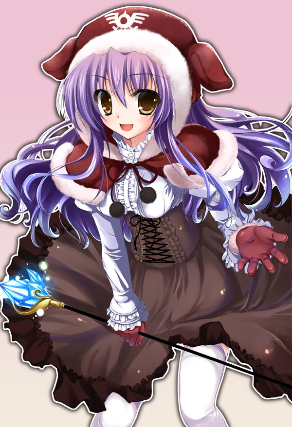 1girlbreastsfemale focusgloveshoodlong hairmedium breastsoldschoolpurple hairsolothighhighswandwhite thighhighsyellow eyes