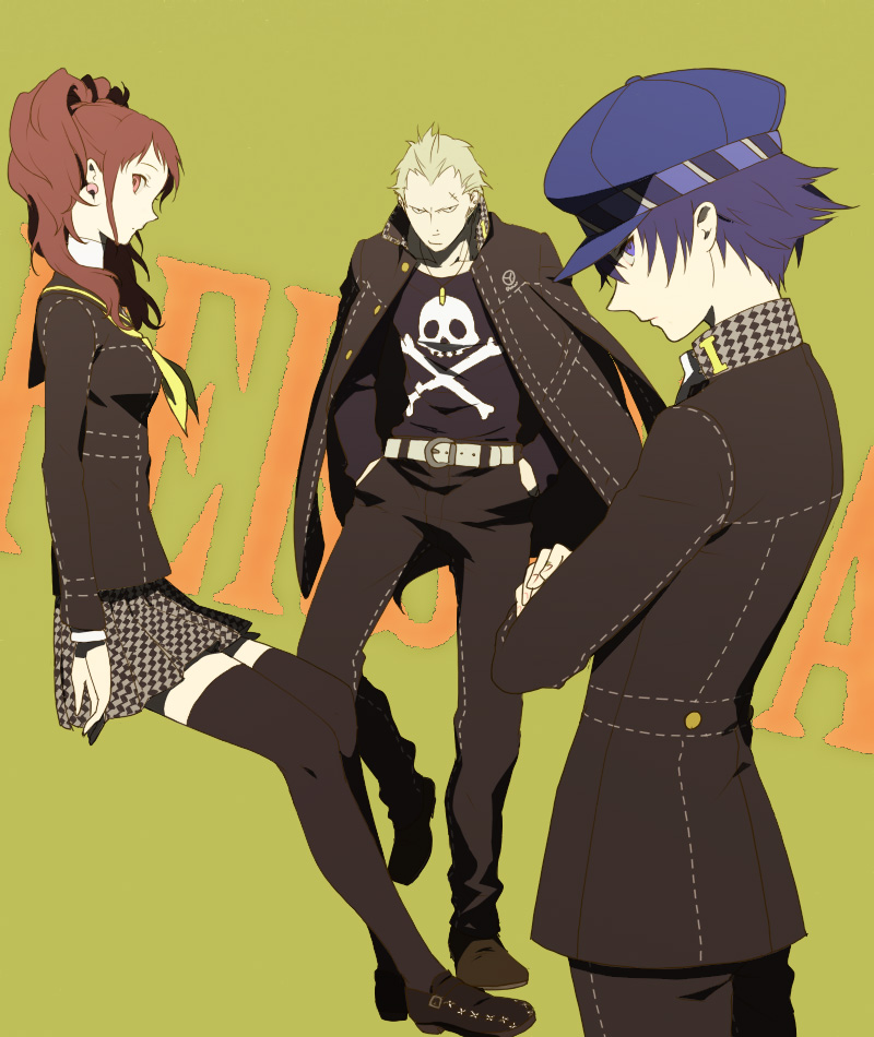 sweeeet him, adashino adami, mr. crawling, homicipher, commentary request, korean commentary, translation request, black hair, black kimono, blood, blood on face, borrowed character, chibi, finger to mouth, flying sweatdrops, green background, grey sweater, hair over one eye, japanese clothes, kimono, korean text, long hair, loving aura, pink hair, red eyes, ringed eyes, simple background, skirt, sweater, very long hair