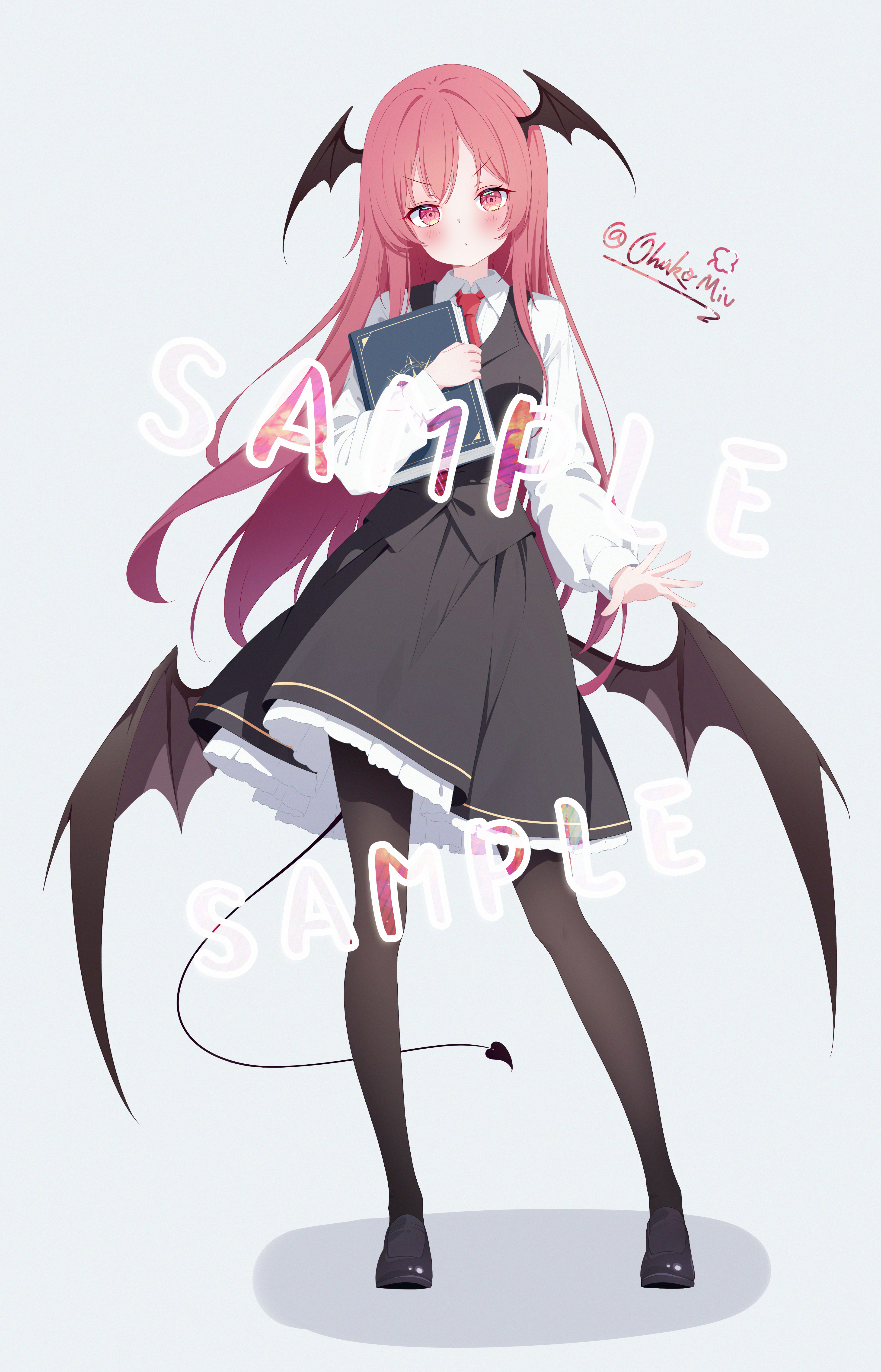 1girlbat wingsblack pantyhoseblack shoesblack skirtblack vestblushbookdemon girldemon tailfull bodyhead wingsholdingholding booklong hairlong sleeveslooking at viewernecktiepantyhosered eyesred hairred necktiesample watermarkshirtshoessimple backgroundskirtskirt setsolostraight hairtachi-etailtwitter usernamev-shaped eyebrowsvery long hairvestwatermarkwhite backgroundwhite shirtwings