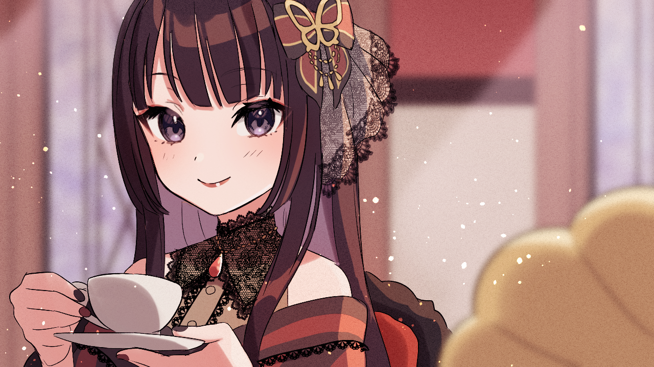 1girlblushbrown eyesbrown hairclosed mouthcupdressholdingholding cupholding saucerlong hairlooking at viewernail polishportraitred dressred nailssaucersmilesoloteacup