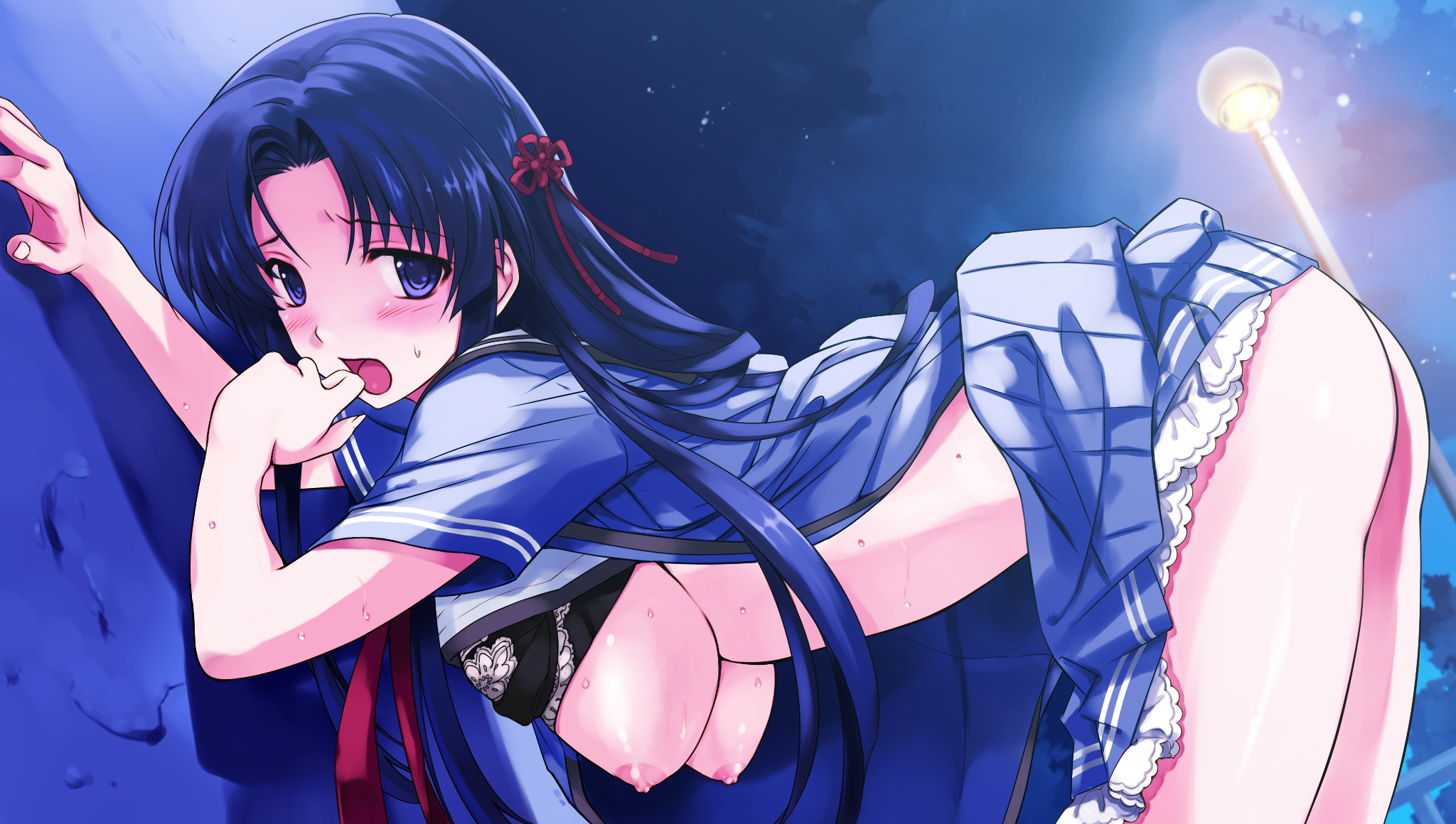 1girlbent overblue eyesblue hairblushbrabra liftbreastsclothes liftfemale focusfinger to mouthlarge breastslingerielong hairmatching hair/eyesnightnipplesopen clothesopen mouthopen shirtschool uniformshirtskirtskirt liftsolounderwear