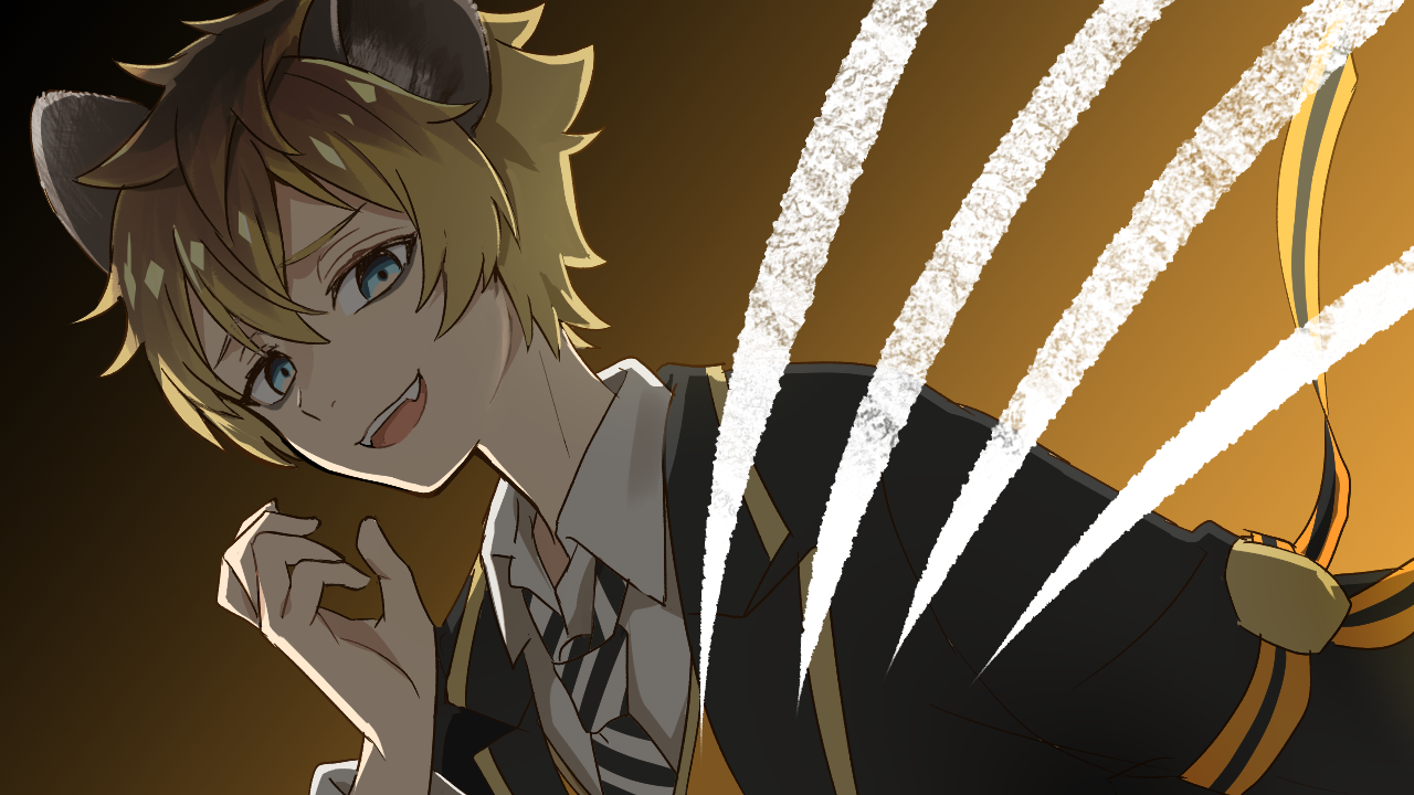 :d1boyanimal earsblack jacketblack necktieblonde hairblue eyescollared shirtdouble-parted bangsfanghair between eyeshand upjacketlong sleeveslooking at viewermale focusnecktieopen mouthorange backgroundshirtshort hairsmilesolostriped necktieupper bodywhite shirt
