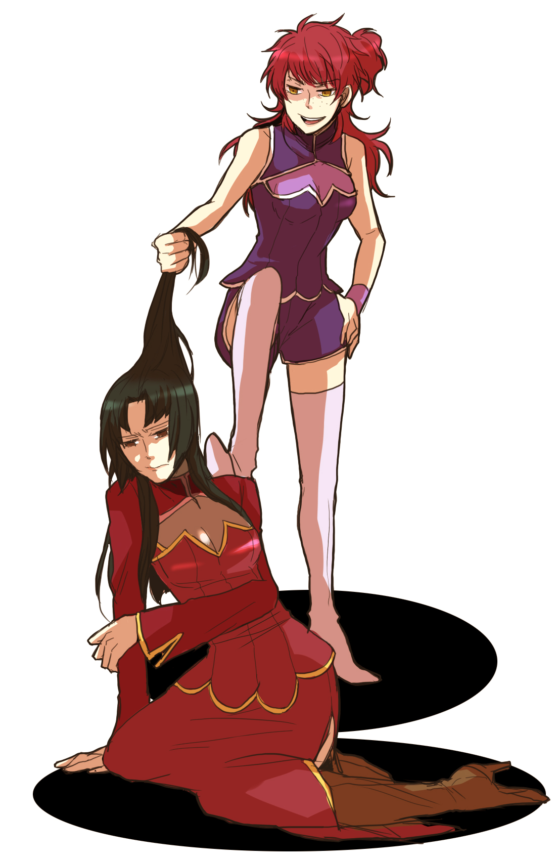 00s2girlsblack hairblousebootsbrown eyesfrecklesfrowngrabbing another's hairgrinhigh heel bootshigh heelsholding another's hairlong skirtmultiple girlsred hairsee-through clothesshirtshortsside ponytailskirtsmilethigh bootsthighhighswhite thighhighswristbandyellow eyes