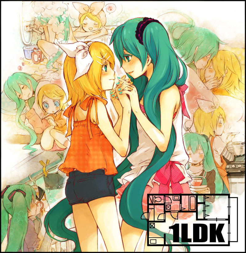 2girlsaqua eyesaqua hairblonde haircamisolelong hairmultiple girlsribbonshort hairshortsskirttwintailsvery long hairyuri