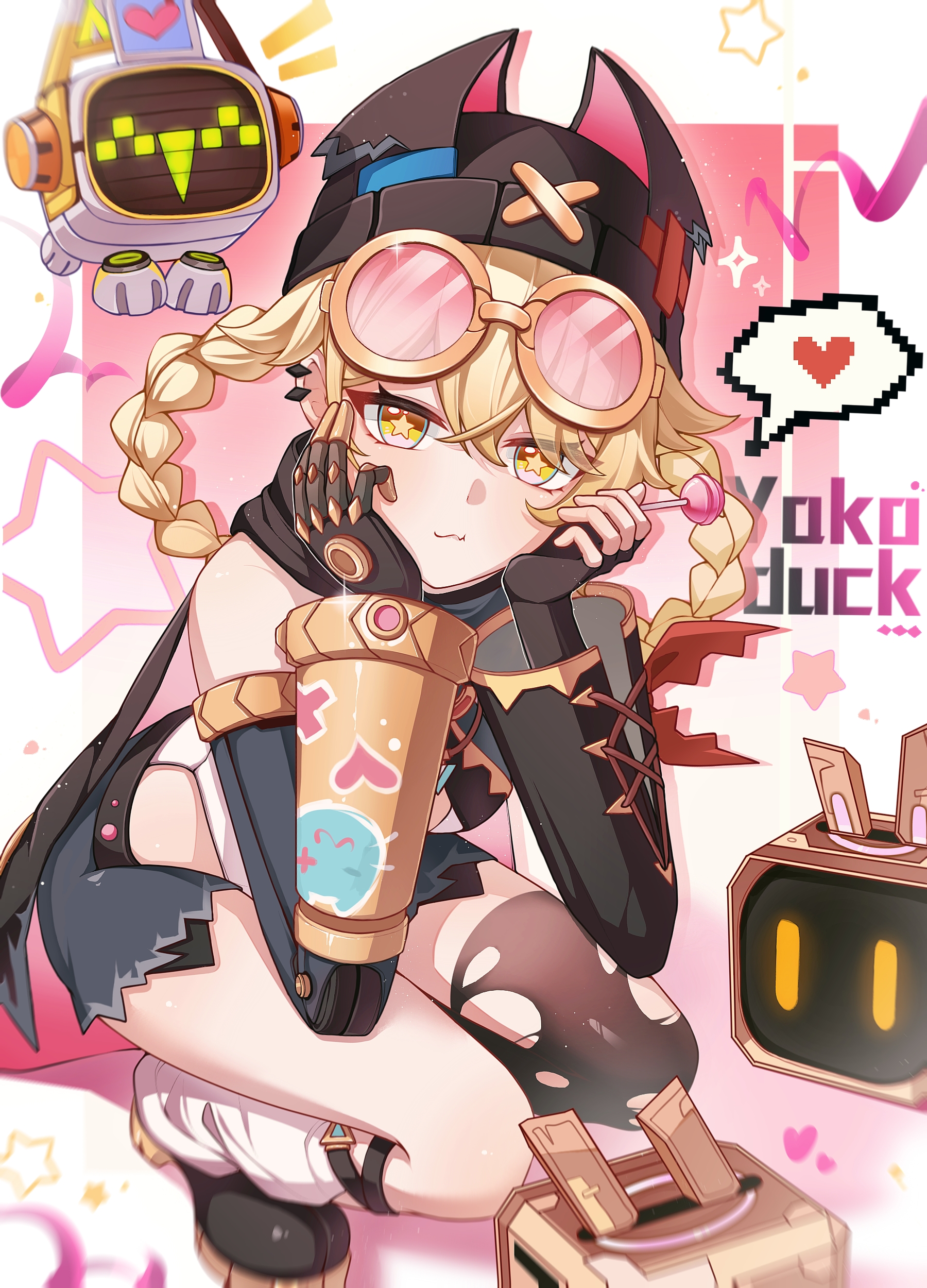 1girlblonde hairbraidbraided hair ringscandyelloxeyewear on headfingerless glovesfoodglovesgogglesgoggles on headhair ringshatheartlollipoplong hairlooking at viewerofficial alternate costumescarfshortssolosquattingstar (symbol)star-shaped pupilssymbol-shaped pupilsthighhighstorn clothestorn thighhighsyellow eyesyellow pupils