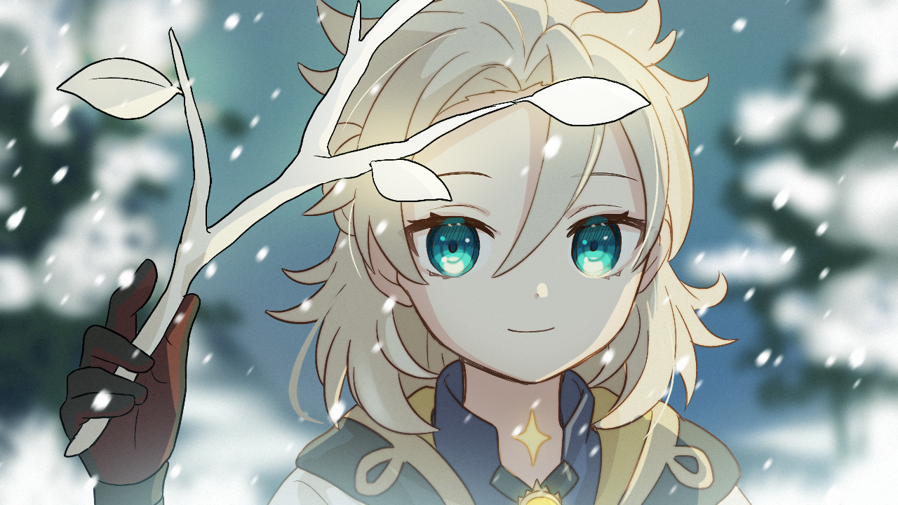 1boyblonde hairblurryblurry backgroundclosed mouthdouble-parted bangsgreen eyeshair between eyesholdingholding plantlong hairlooking at viewermale focusplantportraitsmilesnowflakessolo