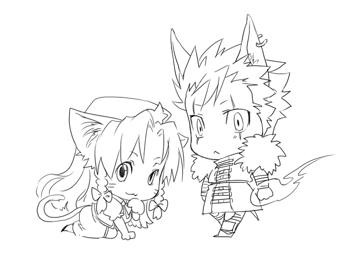 1boy1girlanimal earsbraidcat earscat tailchibicrossoverdog earsearringsgreyscalehatjewelrylong hairmonochromeshort hairtailtwin braids