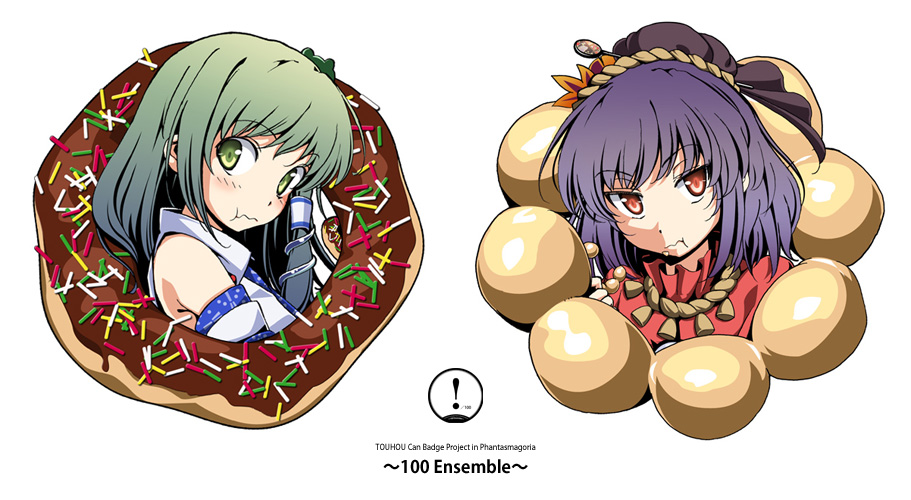 1boy2girlsblushdetached sleevesdonutfemale focusfoodfrog hair ornamentgreen eyesgreen hairhair ornamenthair tubeslong hairmultiple girlspurple hairred eyessimple backgroundsnake hair ornamentsprinklesupper bodywavy mouthwhite background