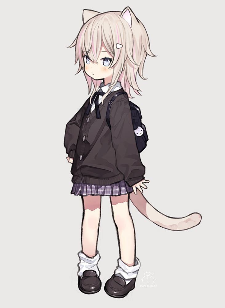 1girlanimal ear fluffanimal earsbackpackbagblack bowblack cardiganblack shoesblue eyesblushbowbrown haircardigancat earscat girlcat tailclosed mouthcollared shirtfull bodygrey backgroundhair between eyeshair ornamenthaircliplong sleevesmulticolored hairpink hairplaid clothesplaid skirtpuffy long sleevespuffy sleevespurple skirtshirtshoessimple backgroundskirtsleeves past wristssockssolostandingstreaked hairtailwhite shirtwhite socks