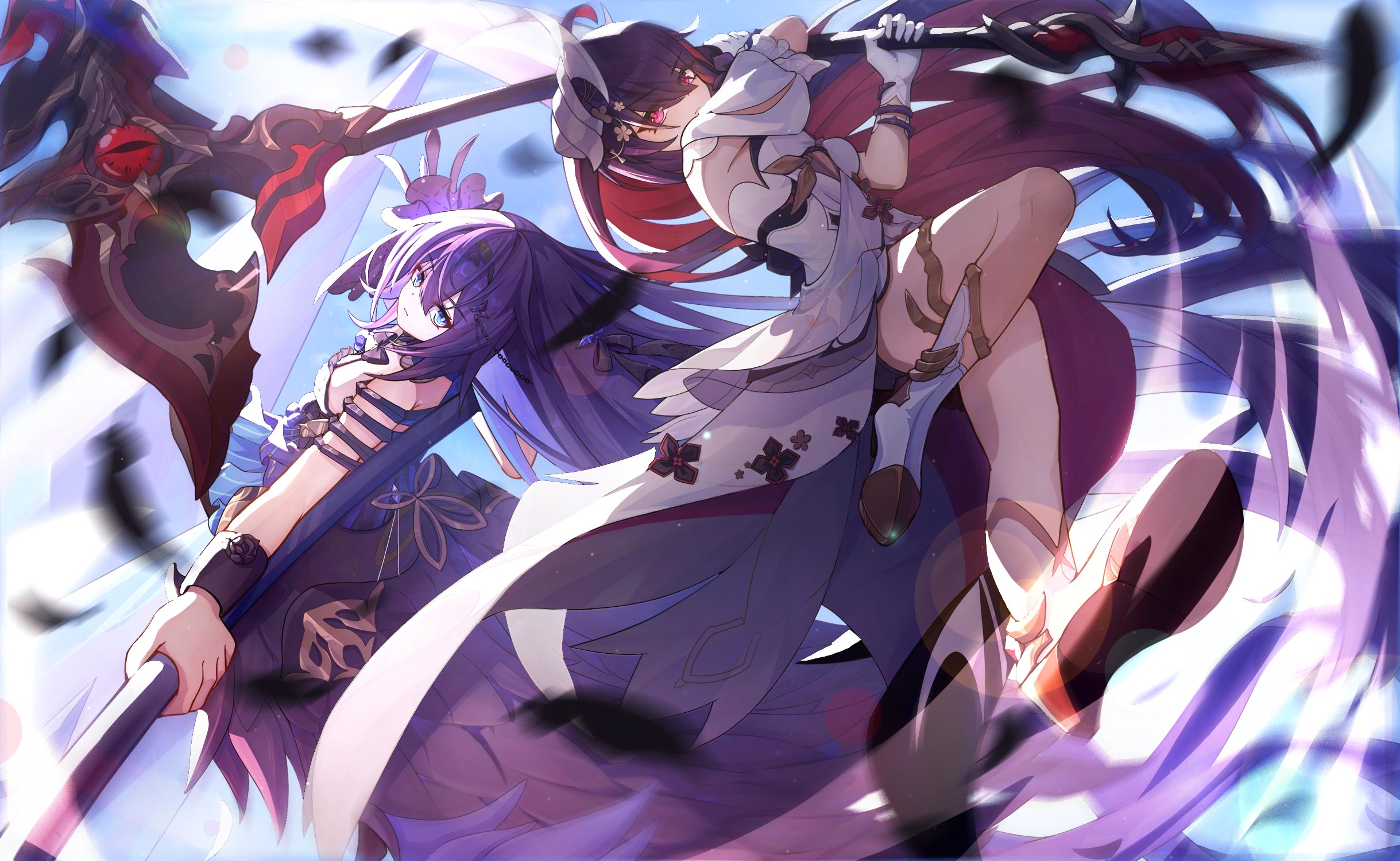 2girlsblack dressblack hairblue eyesblue hairblue skybreastscolored inner hairdressdual personaglovesholdingholding scythelong hairmedium breastsmulticolored hairmultiple girlsofficial alternate costumered eyesred hairscytheskytwo-tone hairvery long hairwhite dresswhite gloves