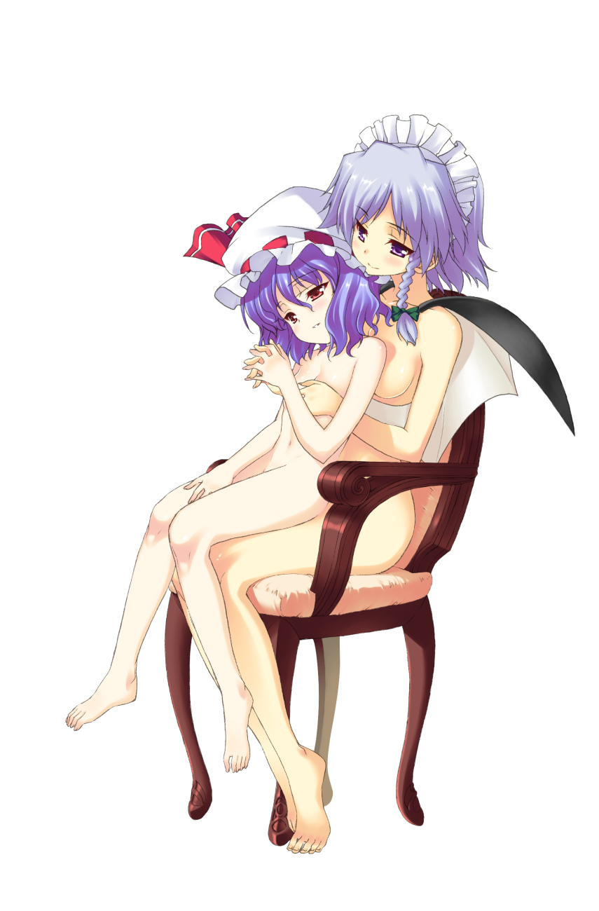 2girlsage differencearmchairbarefootblushbraidbreast pressbreastschaircouplefeetfemale focusfrom behindgirl on topgrabbing another's breastgropinghathead tiltholding handslegslolimaid headdressmultiple girlsnudeonee-lolipurple eyesred eyesshort hairsimple backgroundsittingsitting on lapsitting on personsmiletwin braidswing gripwingsyuri