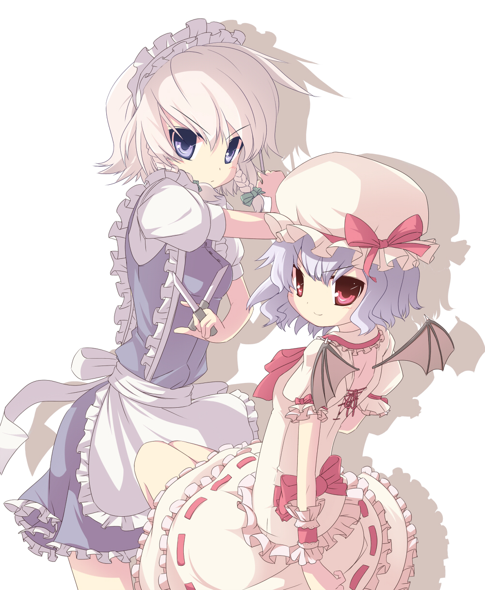 2girlsapronblue dressblue eyesblushcowboy shotdressfemale focushatknifelooking at viewermob capmultiple girlspuffy short sleevespuffy sleevesred eyesshort hairshort sleevessimple backgroundtaremethrowing knifewaist apronweaponwhite background