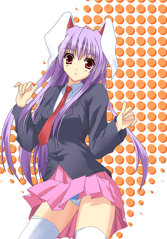 1girlanimal earsfemale focuslong hairnecktiepantiespantyshotpurple hairrabbit earsred eyesred necktieskirtsolostriped clothesstriped pantiesthighhighsunderwearwhite thighhighs