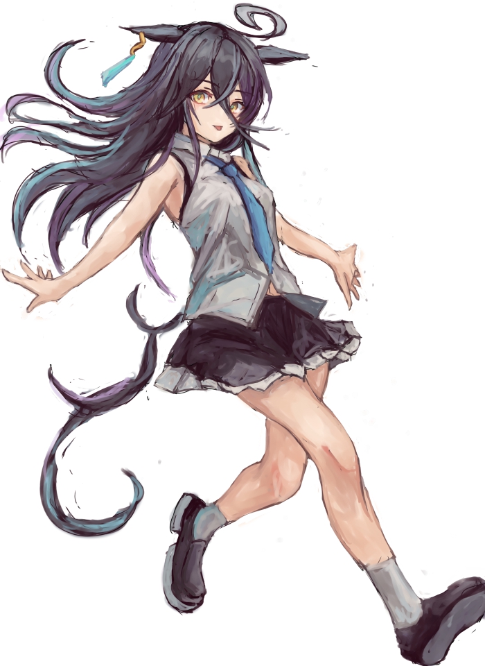 1girlahogeanimal earsblack hairblack skirtblue necktiecollared shirtear tagearringshair between eyeshorse earshorse girlhorse tailjewelrylong bangslong hairlong hair between eyeslooking at viewermulticolored hairnecktieopen mouthshirtshoessimple backgroundsingle earringskirtsleevelesssleeveless shirtsmilesockssolotailwhite backgroundwhite hairwhite shirtwhite socksyellow eyes