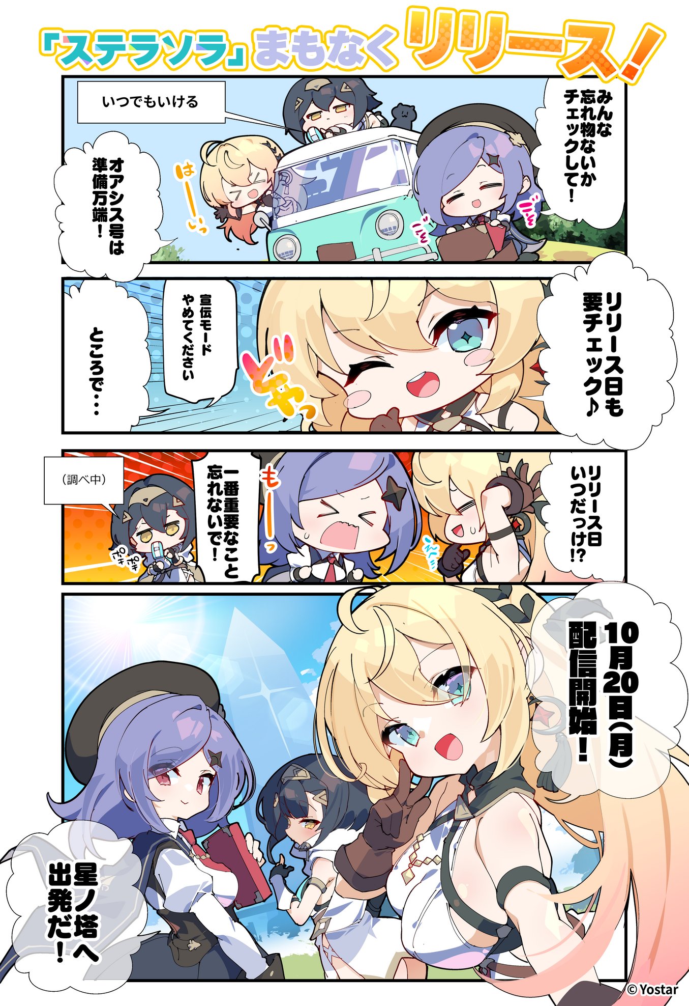 :d1boy3girlsahogeberetblack catblack hairblack hatblack skirtblonde hairblue eyesblush stickersbreastscatcellphoneclosed eyesflip phonegradient hairhatholdingholding phonejuliet sleeveslarge breastslong hairlong sleevesmotor vehiclemulticolored hairmultiple girlsnecktienew star guild (stella sora)one eye closedopen mouthorange hairphonepuffy sleevespurple hairred necktieselfieshirtsideboobsideless dresssideless shirtskirtsmilesparkle hair ornamentspeech bubblestar (symbol)star-shaped pupilssymbol-shaped pupilstext messagingvanwhite shirtxdyellow eyes