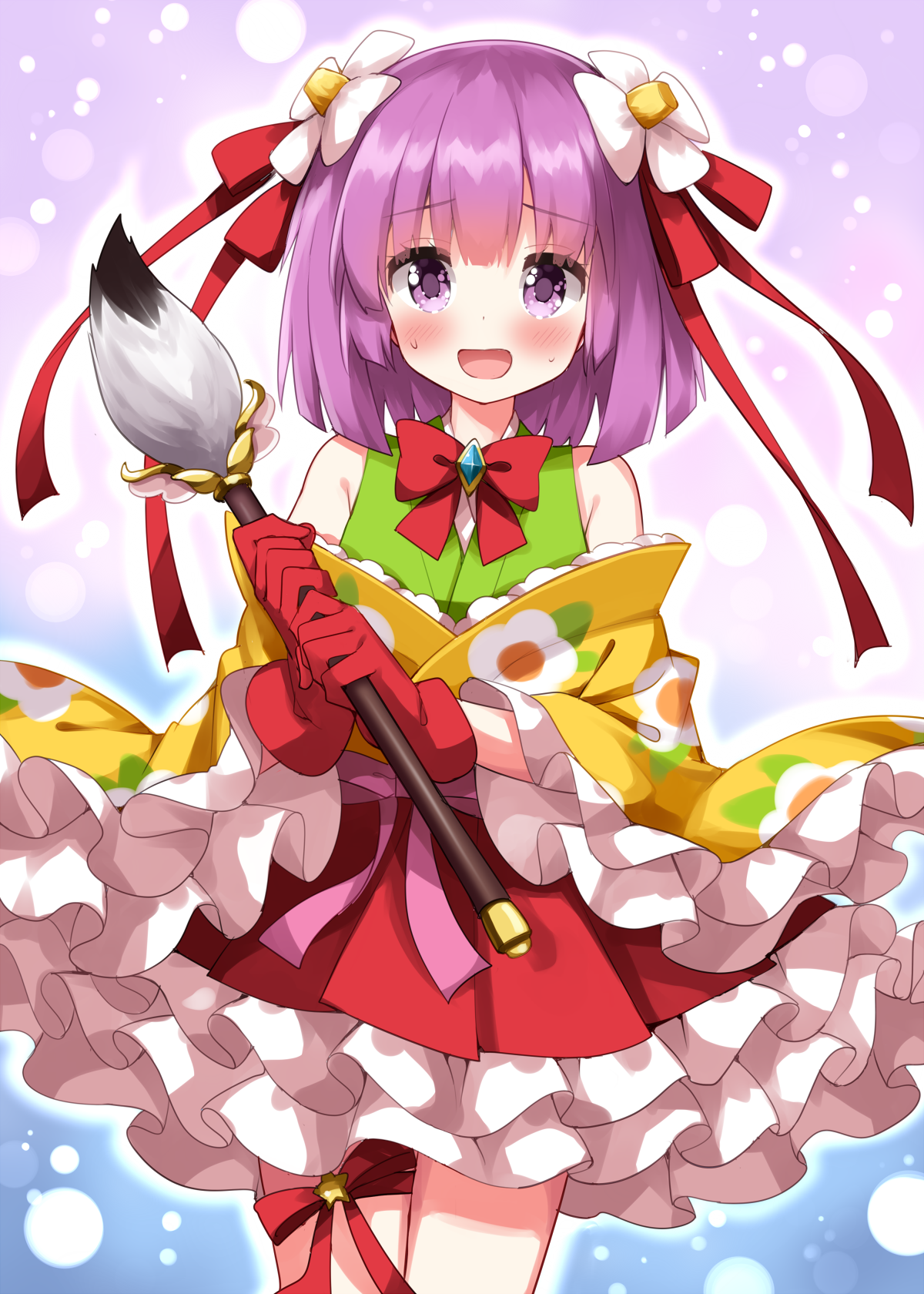 1girlalternate costumebare shouldersblunt endsblushbowbowtiecalligraphy brushcowboy shotflowerfrillsgemglovesgreen vesthair flowerhair ornamenthair ribbonholdinglooking at viewermagical girlmedium hairnervousopen mouthoversized objectpaintbrushpetticoatpleated skirtpurple eyespurple hairred bowred bowtiered glovesred ribbonred skirtribbonskirtsolostandingstar (symbol)sweatdropvestwhite flower