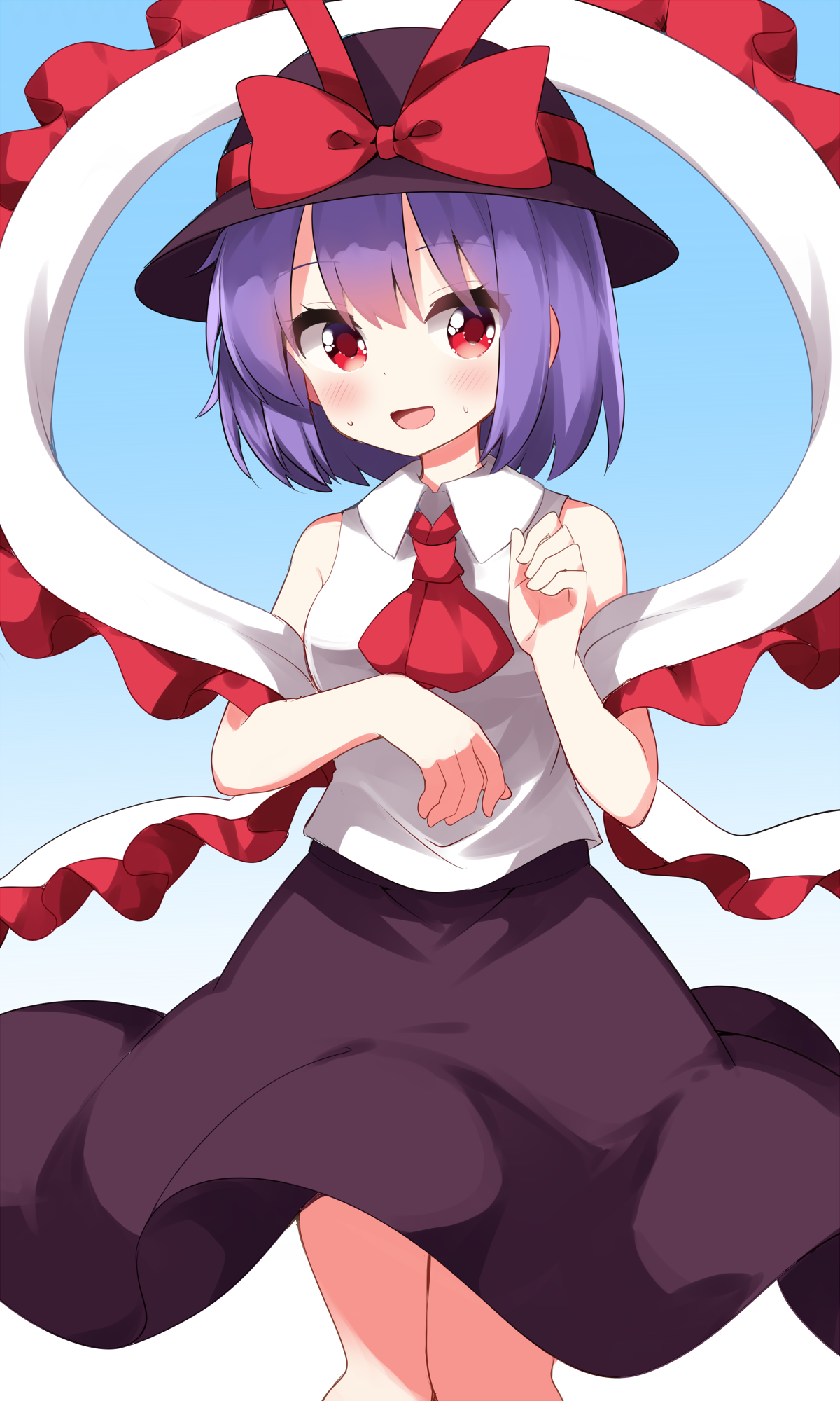 :d1girlascotbare shouldersblack hatblack skirtblue backgroundblushbowcollared shirtcool biz japancowboy shoteyes visible through hairfrilled shawlfrillsgradient backgroundhagoromohathat bowopen mouthpurple hairred ascotred bowred eyesred shawlshawlshirtshort hairskirtsleevelesssleeveless shirtsmilesolostandingsweatdropwhite backgroundwhite shawlwhite shirt