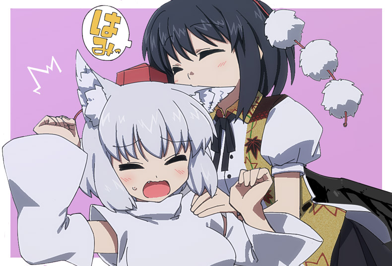 2girlsanimal earsbitingblack hairclosed eyesdetached sleevesfemale focushappyhatmultiple girlsshort hairsurprisedtokin hatwincewolf earsyuri
