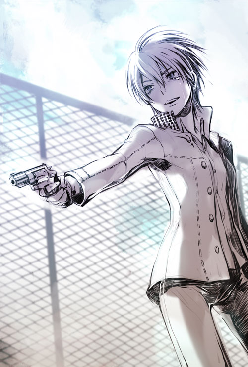 1girlandrogynouschain-link fencefemale focusfencegunhandgunmonochromereverse traprevolverschool uniformshort hairsolotearsweapon
