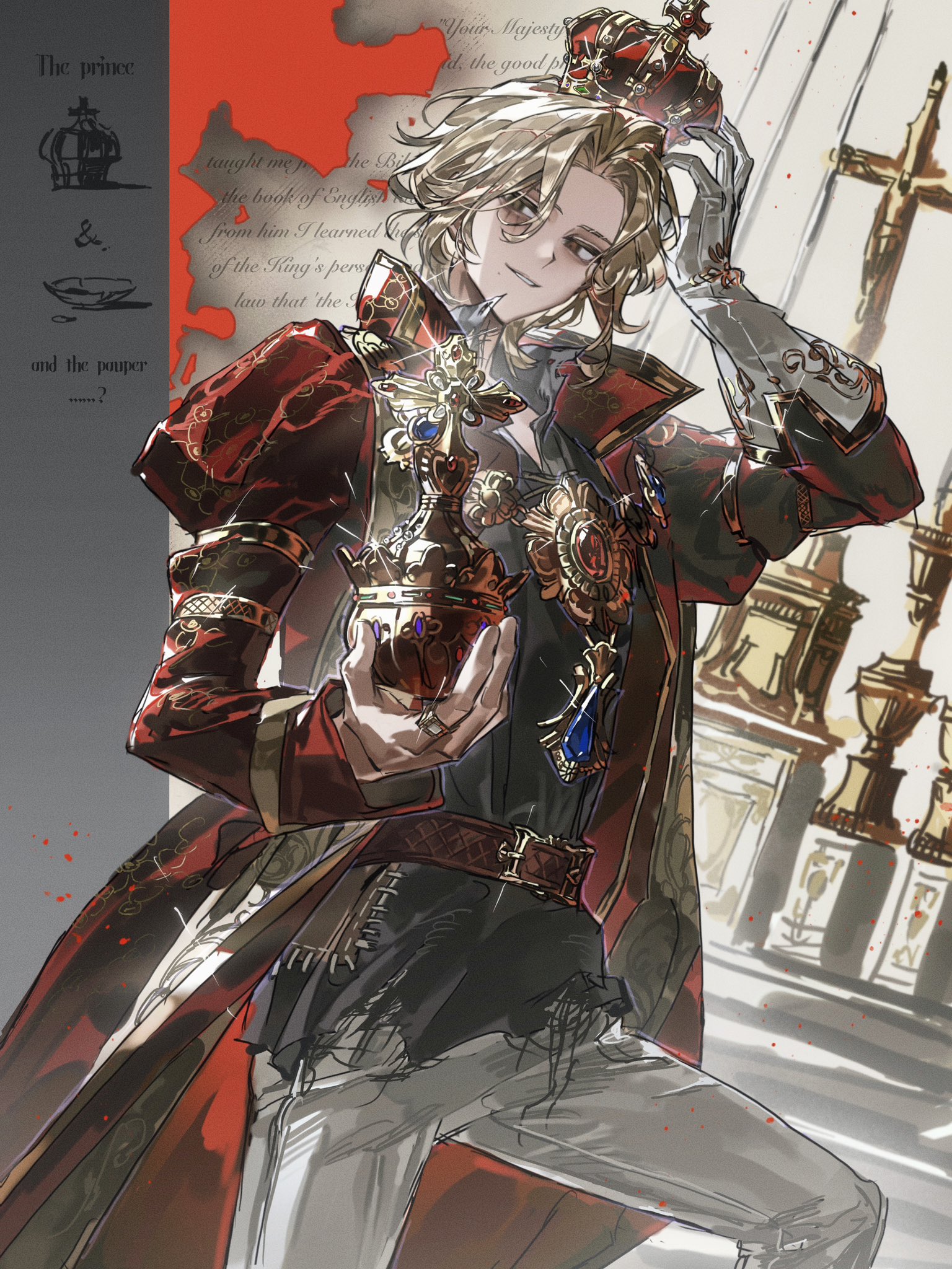 1boybeltblack shirtblonde hairbottlebrown beltbrown eyescowboy shotcrownenglish textglovesgold trimhair intakeshead tilthigh collarholdingholding bottlejewelrylooking to the sidemale focusmolemole under mouthpantspatchpuffy sleevesred crownrichard sterlingrichard sterling (edward beneath the crown)ringshirtsingle glovesmilesolowhite gloveswhite pants
