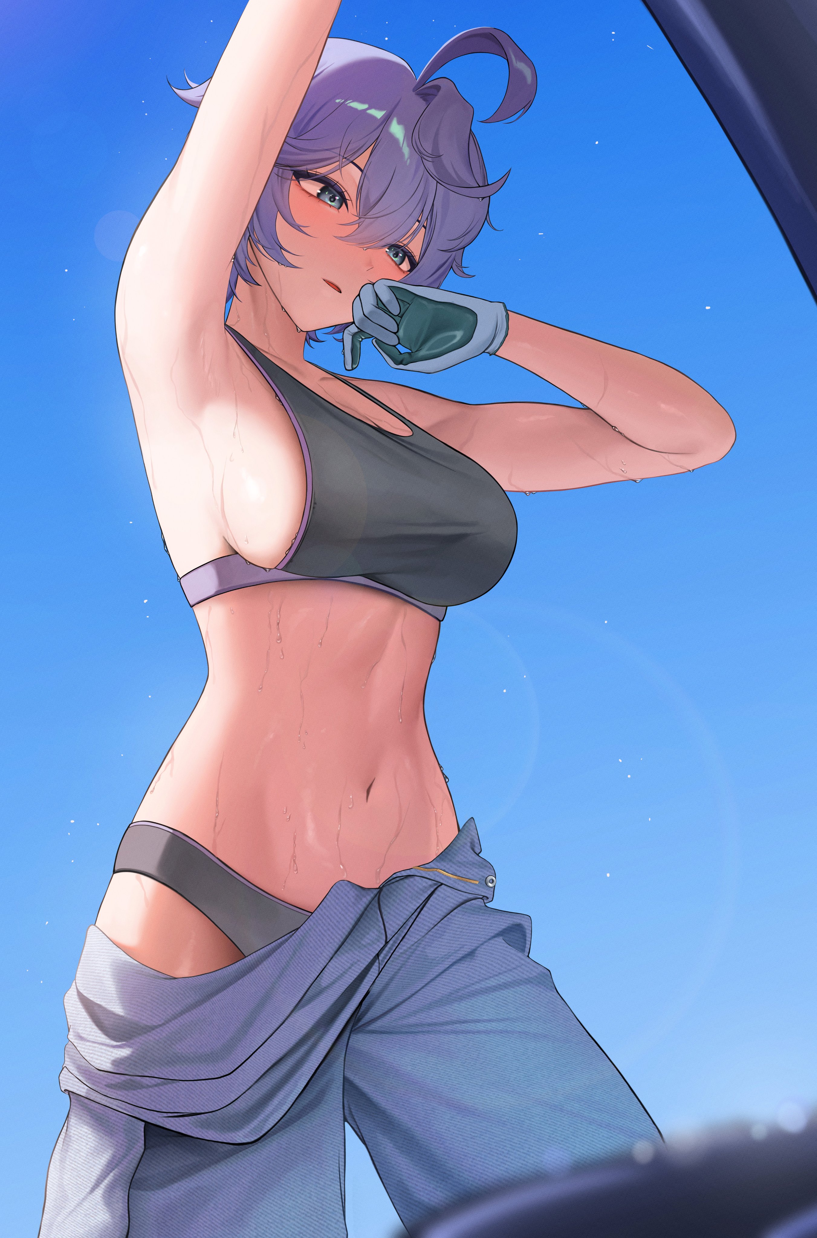 takino natsuki, anonymous (mirage-soft), artist request, game cg, source request, 1girl, barefoot, bed, bed sheet, bloom, blue eyes, blue hair, breasts, breasts apart, censored, feet, female focus, large breasts, leg lift, long hair, matching hair/eyes, mosaic censoring, nipples, nude, pussy, sheet grab, soles, solo, toes
