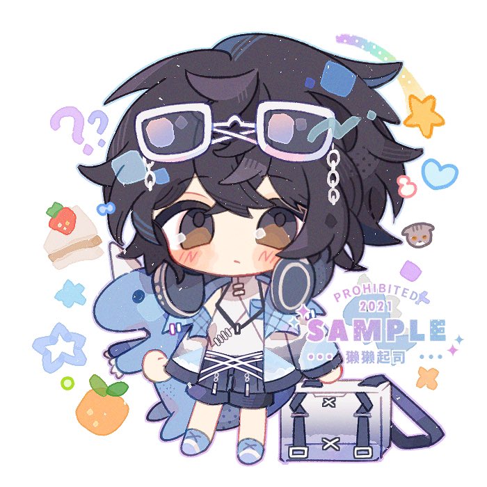 1boy1girlblack hairblack shortsblue jacketblue shoesblush stickersbrown eyeschibichibi onlyclosed mouthcrossed bangseyewear on headfull bodyheadphonesheadphones around neckjacketlong sleeveslooking at vieweropen clothesopen jacketshirtshoesshort hairshortssimple backgroundsolostandingwhite backgroundwhite shirt