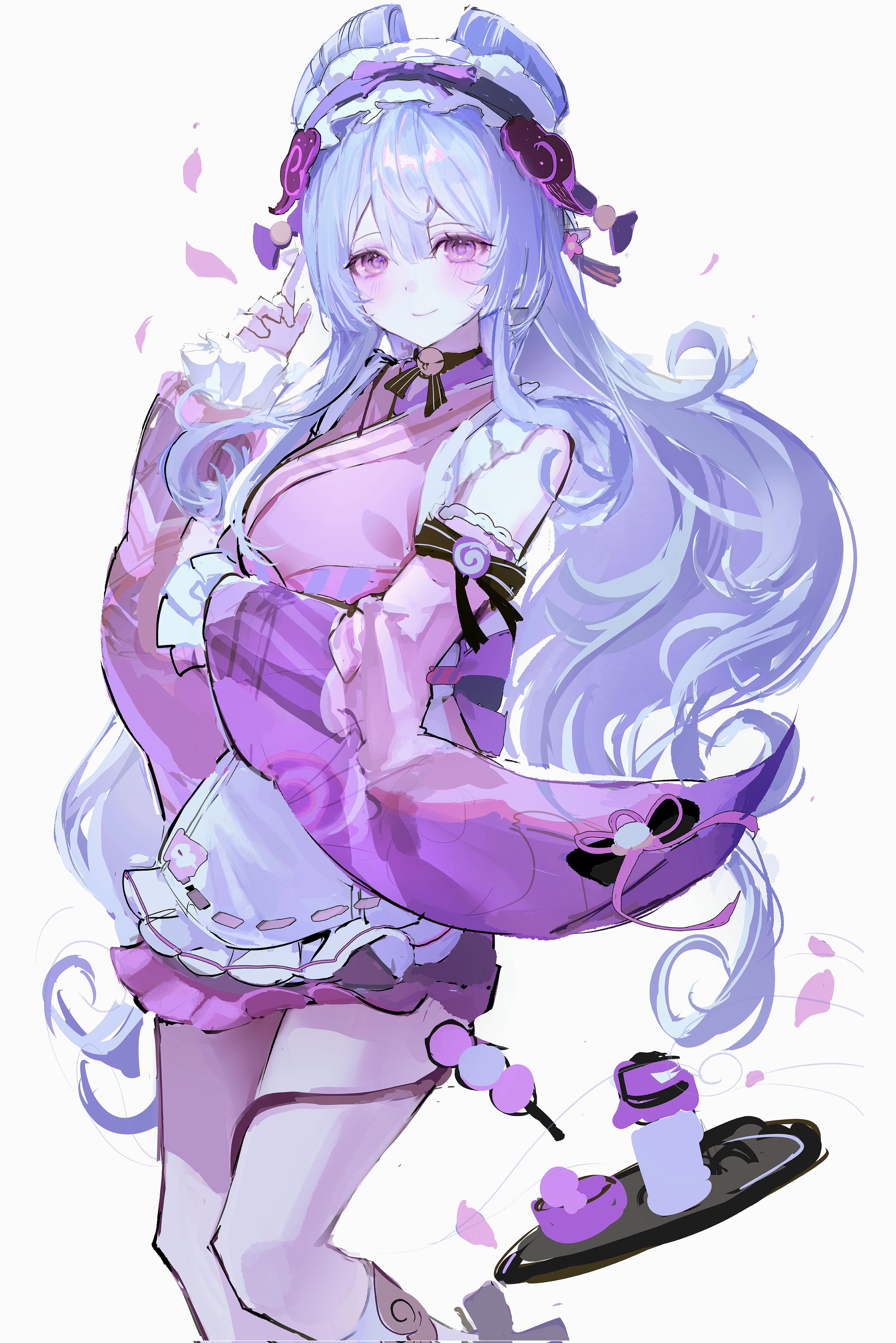 1girl8x9 1tapronbare shouldersblack chokerblue hairblushbreastschokerclosed mouthdangodetached sleevesfalling petalsfeet out of framefinger to headfloating trayfoodfrilled hairbandfrilled kimonofrillshair between eyeshairbandindex finger raisedjapanese clotheskimonolarge breastslong hairlooking at viewernihongamipetalspink eyespink kimonopink petalssimple backgroundsmilesolotrayvery long hairwagashiwhite apronwhite backgroundwide sleeves
