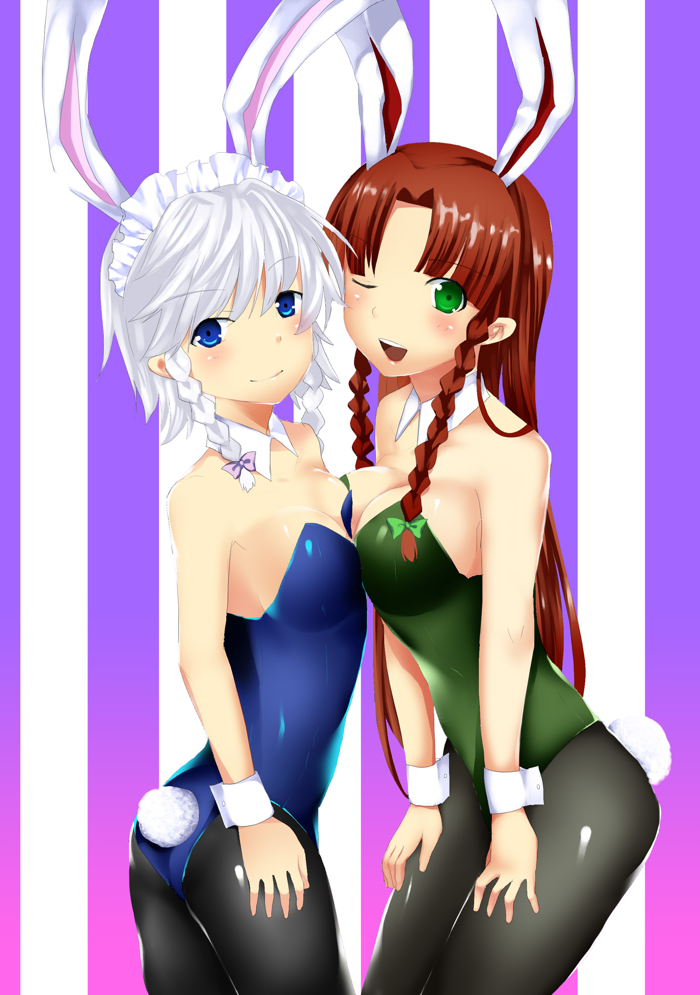 2girlsanimal earsblue eyesbraidbreast pressbreastsbrown hairfemale focusgreen eyeslarge breastslong hairmultiple girlsone eye closedpantyhoseplayboy bunnyrabbit earsshort hairsmall breastssymmetrical dockingtwin braidswhite hairwink