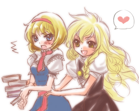 2girlsannoyedblonde hairblue eyesblushbookbraidfemale focushairbandheartlong hairmultiple girlsshort hairyellow eyes
