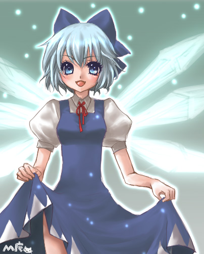 1girlblue eyesblue hairclothes liftdressfemale focusgradient backgroundmatching hair/eyesskirtskirt holdskirt liftsolowings