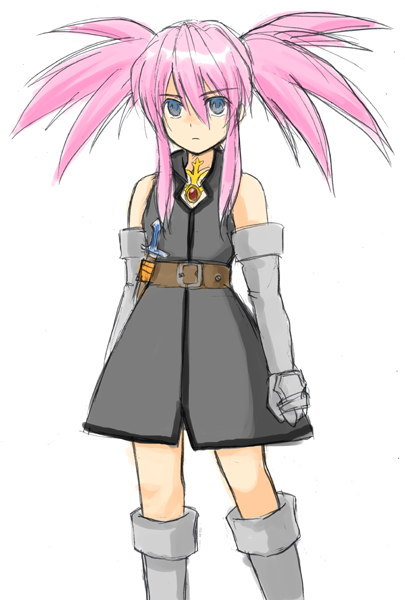 00s1girlblue eyesbootsdaggerelbow glovesexpressionlessfemale focusglovesknee bootsknifepink hairsolotwintailsweapon