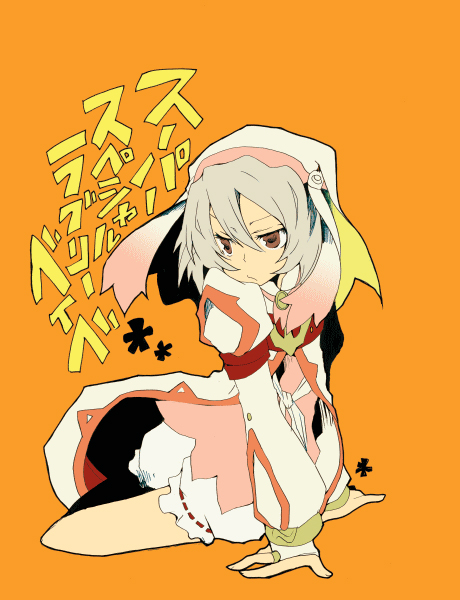 00s1girlbloomersbrown eyesfemale focushatorange backgroundshort hairsolounderwearwhite bloomerswhite hair