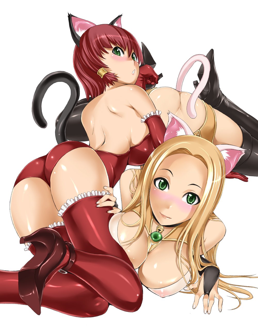 2girlsanimal earsassblonde hairblushbootsbreastscat earscat tailcleavageelbow glovesglovesgreen eyeshigh heelslarge breastslong hairmultiple girlsred hairshoesshort hairtailthigh bootsthighhighs