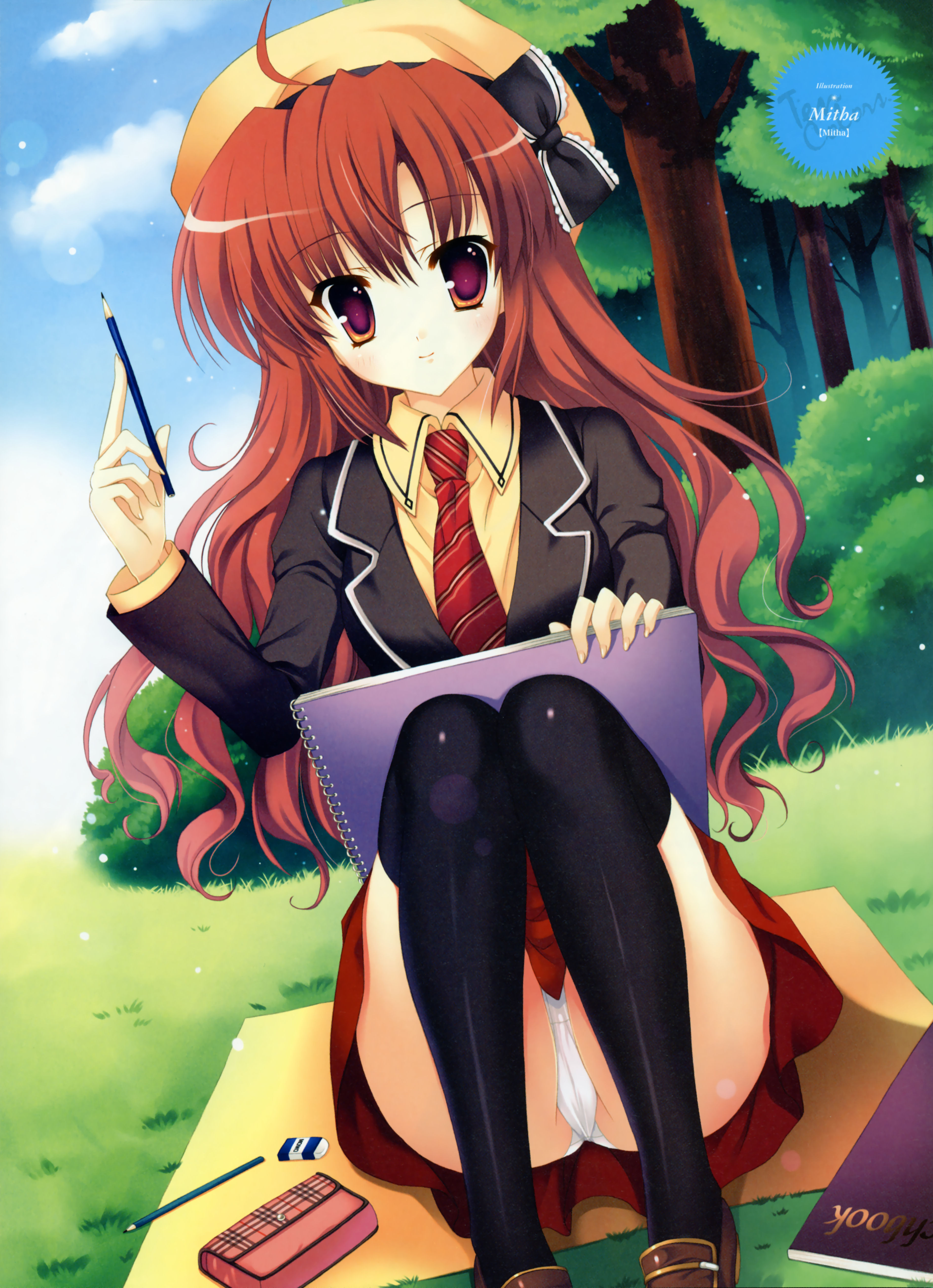black thighhighsgrasslong hairnotebookorange hairpantiespink eyesschool uniformsittingsolothighhighsunderwearwhite panties