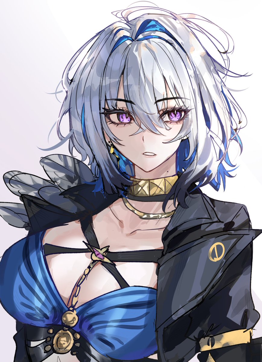 1girlblack jacketblue brablue hairbrabreastscollarbonecolored inner haircropped jacketearringsgold chokergrey hairhair between eyesjacketjewelrylarge breastslooking to the sidemedium hairmolemole on neckmulticolored hairparted lipspurple eyessimple backgroundsolounderwearupper bodywhite background