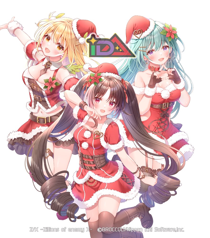 3girlsarane (z/x)bare shouldersbeltblack beltblack glovesblack hairblack shoesblack thighhighsblonde hairbreastscana (z/x)chokercleavagecollarcopyright logodrill hairfingerless glovesflowerfur trimfur-trimmed glovesfur-trimmed skirtgarter strapsglovesgreen hairhair flowerhair ornamenthathat ornamentheartheart hat ornamentlarge breastslogomedium breastsmidriffmultiple girlsnavelopen mouthpom pom (clothes)pom pom hair ornamentpurple eyesred chokerred collarred eyesred flowerred skirtsanta costumesanta hatshoesskirtthighhighstwin drillstwo side upwhite bagyellow eyes