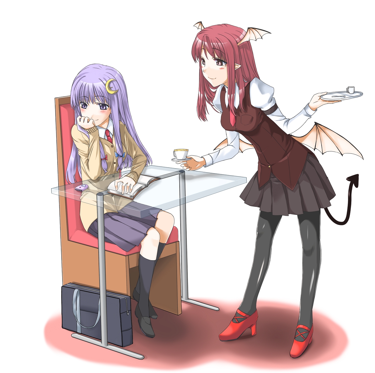 2girlsalternate costumearmbandblack socksblazerblushbookbowbreastsbriefcasebuttonscasualcellphonechaircoffeecontemporarycrescentcrescent hair ornamentcupdemon taildeskdress shirtfemale focushair bowhair ornamenthand on own cheekhand on own facehead wingshigh heelsjacketkneehighslong hairlong sleeveslow wingsmedium breastsmultiple girlsnecktieno headwearopen bookpantyhosephonepleated skirtpointy earspurple eyespurple hairred eyesred hairred necktiesaucerschool uniformshirtshoessidelockssittingskirtsmilesockstailteacuptrayvestwings