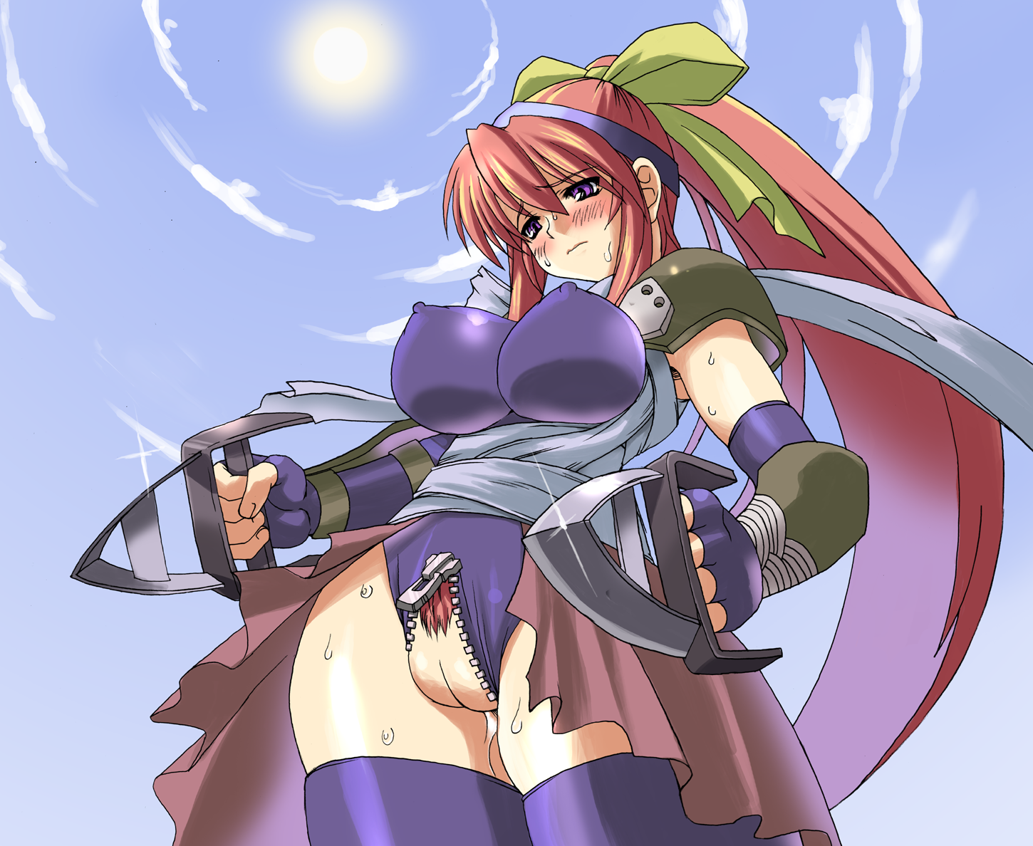 assassinblushbowbreastscovered erect nipplesdaggerelbow glovesfat monsfemale pubic hairglovesjamadharknifelarge breastslong hairponytailpubic hairpurple eyespussyred hairribbonshoulder padsskin tightsolosweatthighhighsuncensoredunzippedvery long hairweaponzipper
