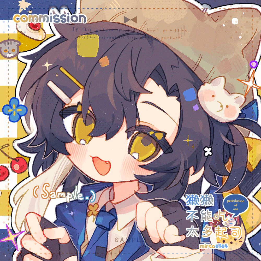 :3:d1girlblack glovesblack hairblue necktieblushbrown hatcollared shirtdouble-parted bangsfangfingerless glovesgloveshair between eyeshands uphatlong hairlong sleeveslooking at viewernecktieopen mouthoutlineportraitshirtsmilesolowatermarkwhite outlinewhite shirtyellow eyes