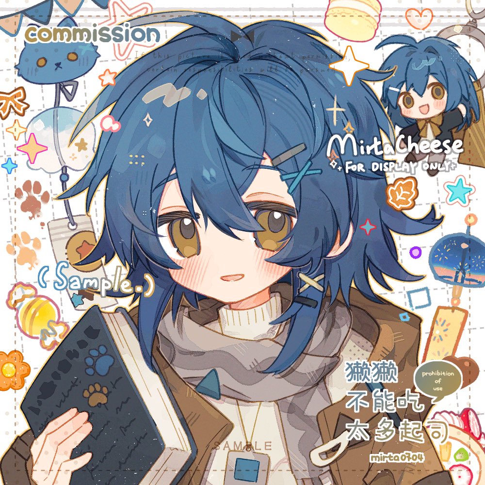 :d1girlblue hairblushbookbrown jacketchibidouble-parted bangsgrey scarfgrid backgroundhair between eyeshair ornamenthairclipholdingholding bookjacketlooking at viewermultiple viewsopen clothesopen jacketopen mouthportraitscarfshort hairsidelockssmilesweaterturtleneckturtleneck sweaterwatermarkwhite backgroundwhite sweaterx hair ornament