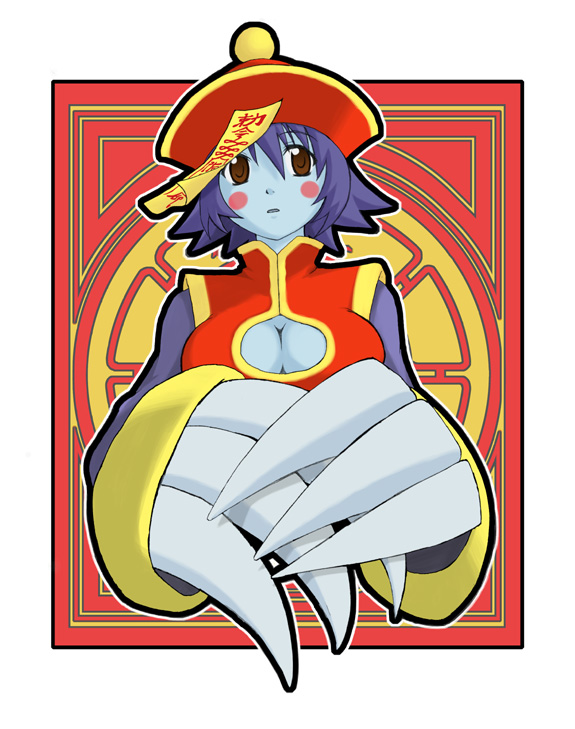 1girlblue hairblue skinblushbreastsbrown eyescleavagecleavage cutoutclothing cutoutcolored skinfemale focusflipped hairhatjiangshiqingdai guanmaoshort hairsolo
