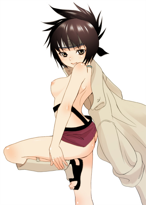 1girlarmorartistic errorassbreastsbrown hairclothes liftfemale focusforehead protectorgreaveshappyheadbandjacketjacket over shoulderjewelryleg liftlooking at viewerlooking to the sidemedium breastsminiskirtnecklaceninjano pantiessandalsshort hairsimple backgroundskirtskirt liftsmall nipplessmilesolostandingstanding on one legsuspenderstopless femaleunworn jacketwhite backgroundyellow eyes