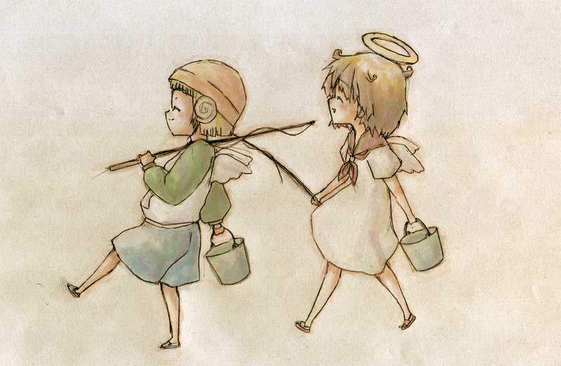 00s2girlsbrown hairbucketclosed eyesfishing rodhalohatmultiple girlsshort hairsmiletraditional halowalkingwings