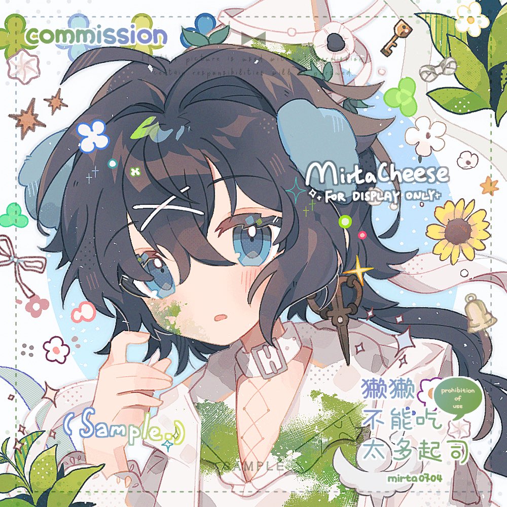 1girlahogeartist nameblack hairblue eyesblushflowerhair between eyeshand upkeylong hairlong sleevesopen mouthportraitshirtsolosunflowerwatermarkwhite shirt