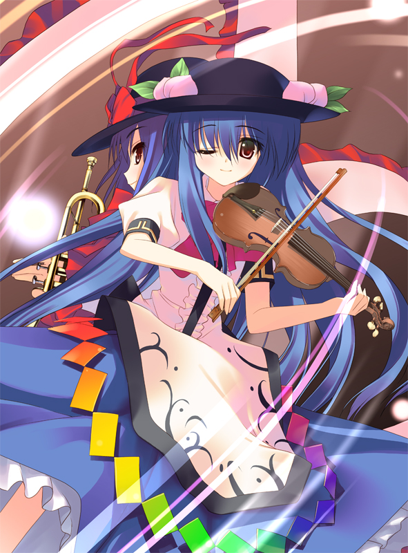 2girlsblue hairbow (music)female focusfoodfrillsfruithatinstrumentleafmultiple girlsone eye closedpeachpurple hairred eyesshawlstandingtrumpetviolinwink