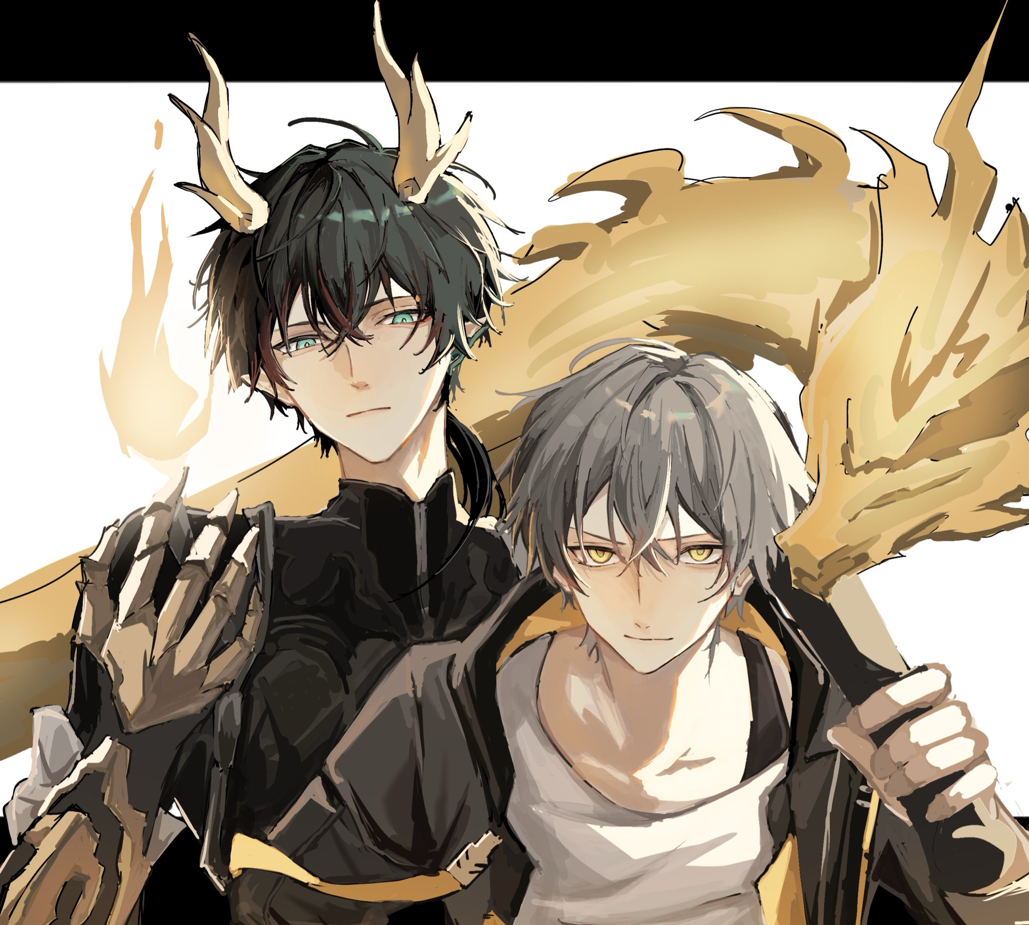 2boysaqua eyesbaseball batblack borderblack coatblack glovesblack hairblack shirtborderchinese clothesclosed mouthcoatcollarbonedragondragon boydragon hornsearclipeyelinerfingerless glovesgauntletsglovesgrey hairhair between eyeshand upholdingholding baseball bathoodhooded coathornslapelslong hairlong sleeveslooking at viewerlow ponytailmagicmakeupmale focusmandarin collarmultiple boysofficial alternate costumeofficial alternate hairstyleopen clothesopen coatoutside borderpointy earsponytailred eyelinerrwi9o2hamz31530shirtshort hairsimple backgroundsmilet-shirttwo-sided coattwo-sided fabricv-shaped eyebrowswhite backgroundwhite shirtyellow coatyellow eyesyellow pupils