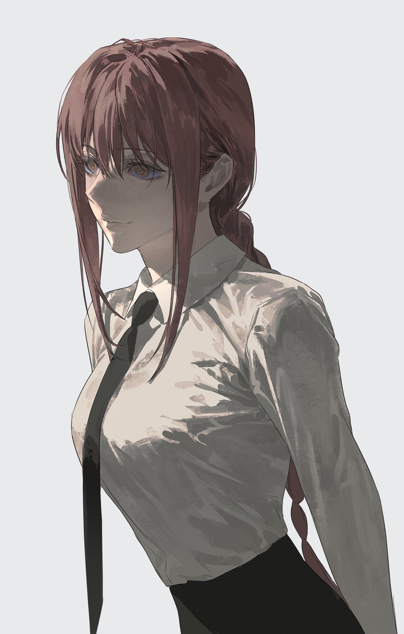 1girlblack necktieblack pantsbraidbreastsbrown eyesclosed mouthcollared shirtempty eyeshair between eyeshigh-waist pantslarge breastslipslong hairlong sleeveslooking to the sidelow-braided long hairlow-tied long hairnecktiepantsred hairringed eyesshirtsidelockssimple backgroundsingle braidsmilesolowhite backgroundwhite shirt