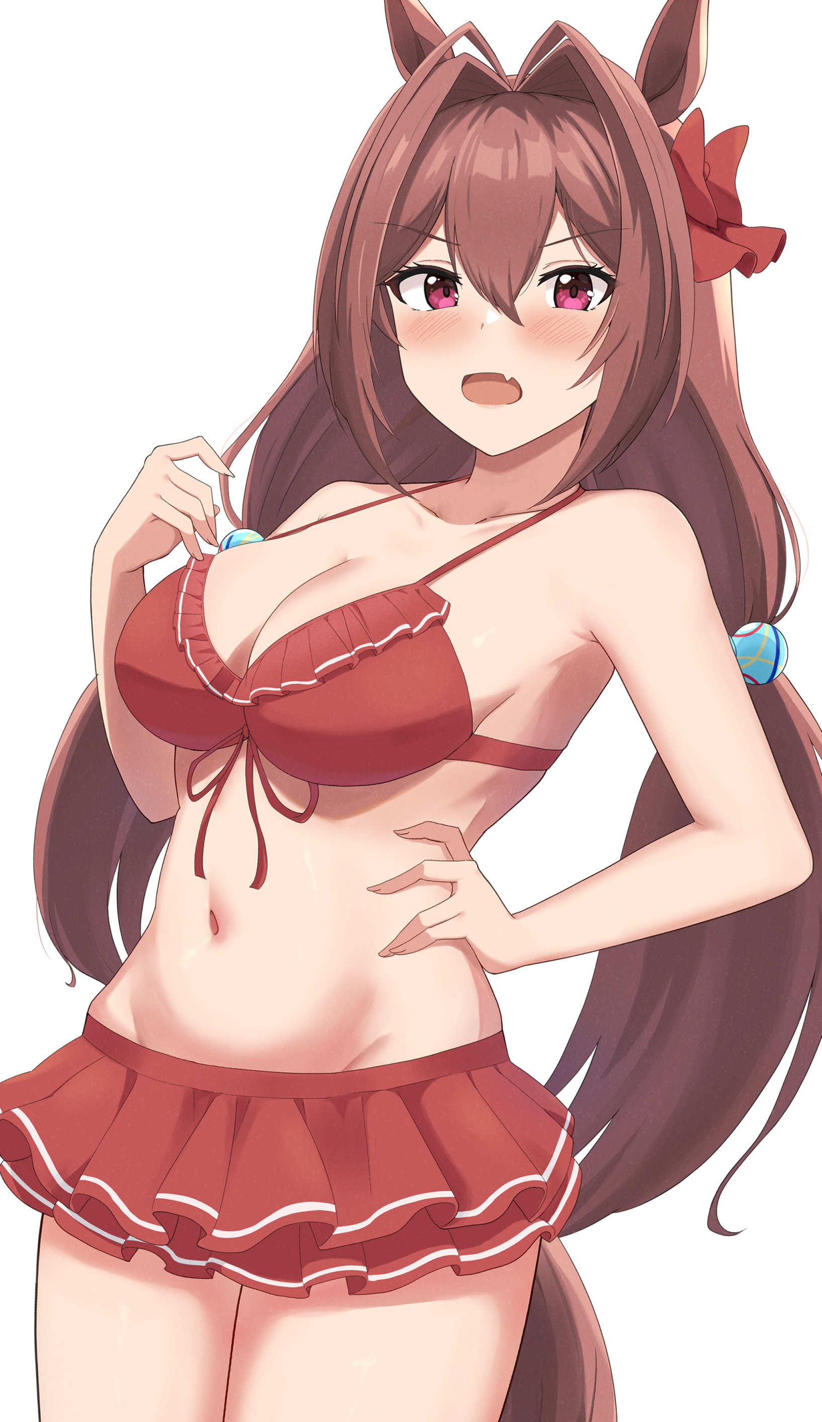 1girlanimal earsbare armsbare shouldersbikinibikini skirtblushbowbreastsbrown hairbrown tailcleavagecollarbonecowboy shotfangfrilled bikinifrillshair between eyeshair bobbleshair bowhair intakeshair ornamenthand on own hiphand uphorse earshorse girlhorse taillarge breastslong hairlooking at viewerlow twintailsnavelopen mouthpleated skirtred bikinired bowred eyesred skirtsimple backgroundskin fangskirtsolostandingswimsuittailtwintailsv-shaped eyebrowsvery long hairwhite background
