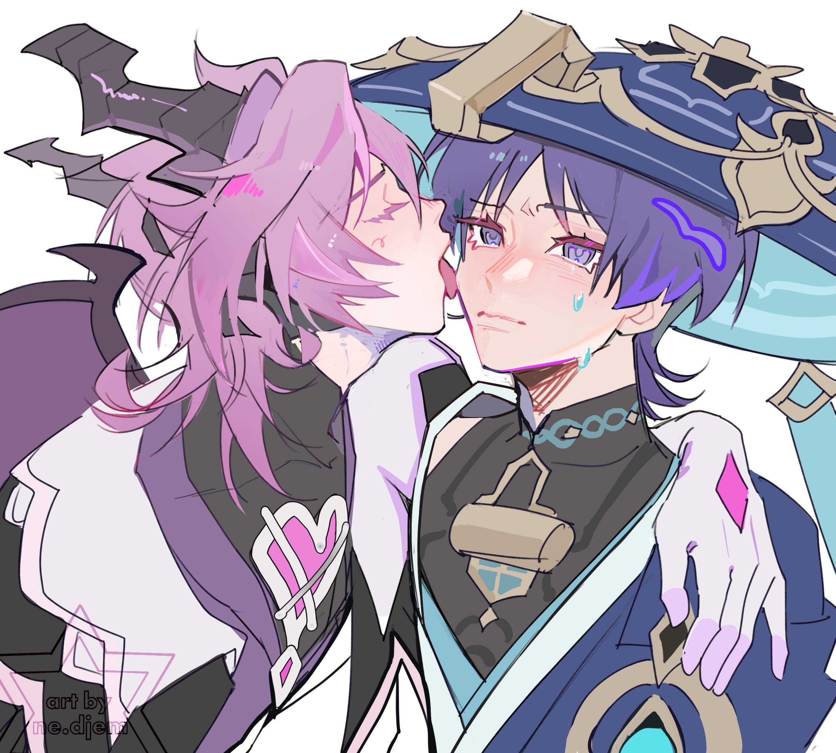 2boysblue eyesblue hairclosed eyesclosed mouthcoupledragon boydragon hornsdragon wingsfriendsfrom sidegloveshair between eyeshathearthornsjapanese clothesleaning forwardleaning on personleaning to the sidelickinglicking another's facelong sleevesmultiple boyspurple hairshort hairsimple backgroundstandingsweattonguetongue outupper bodywhite backgroundwingsyaoi