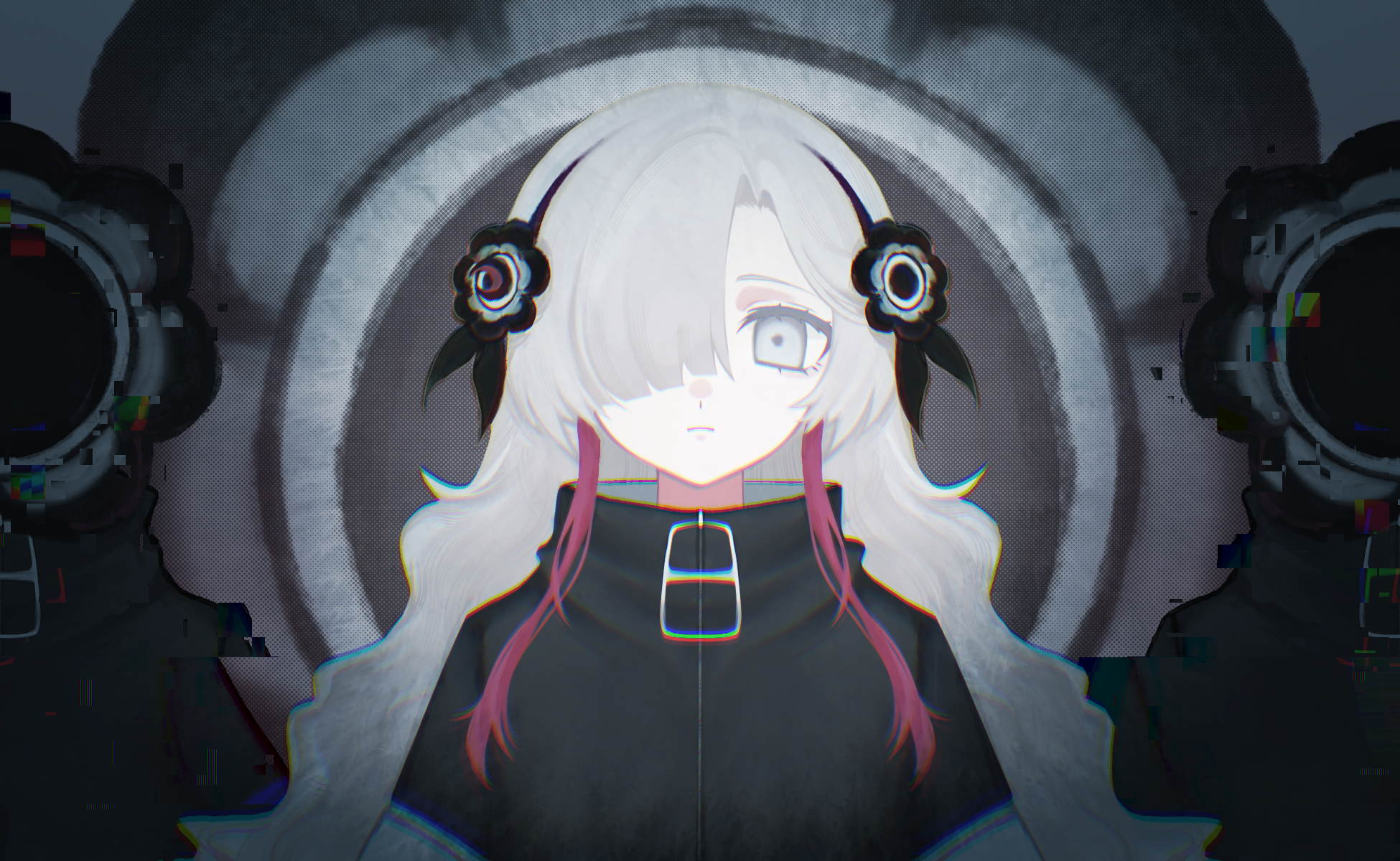 1girl2othersblack coatcoatexpressionlessflowerglitchgrey eyesgrey hairhair over one eyekisira 0509looking at viewermulticolored hairmultiple othersred hairstraight-ontwo-tone hair